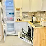 - ❓Există o bucătărie disponibilă la apartamentul pentru oaspeți?Da, apartamentul dotată cu o bucătărie complet utilată și oferă un ceainic electric, aparat de cafea/ceai și ustensile de bucătărie.